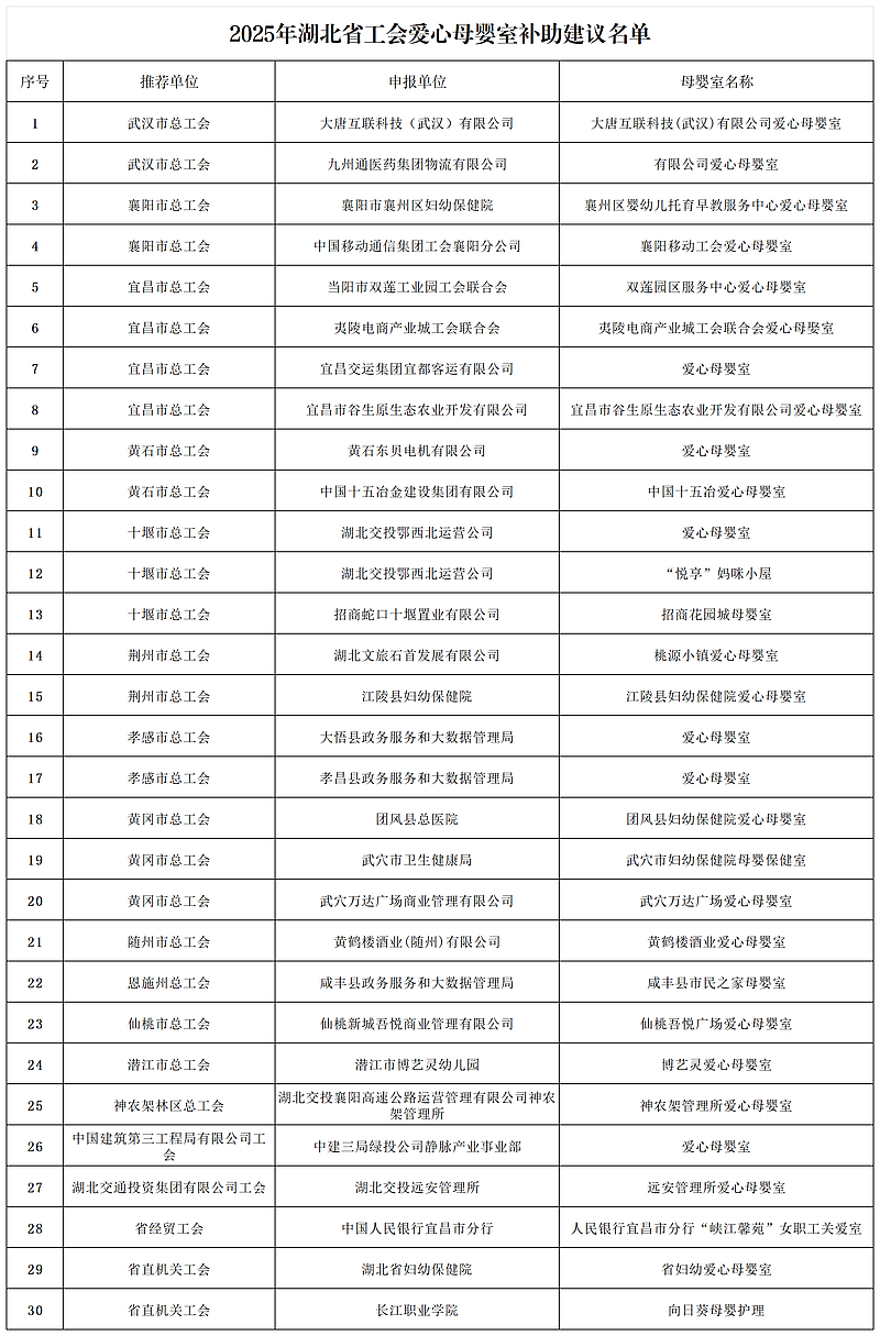 附件:1.2025年湖北省工会爱心母婴室补助建议名单;