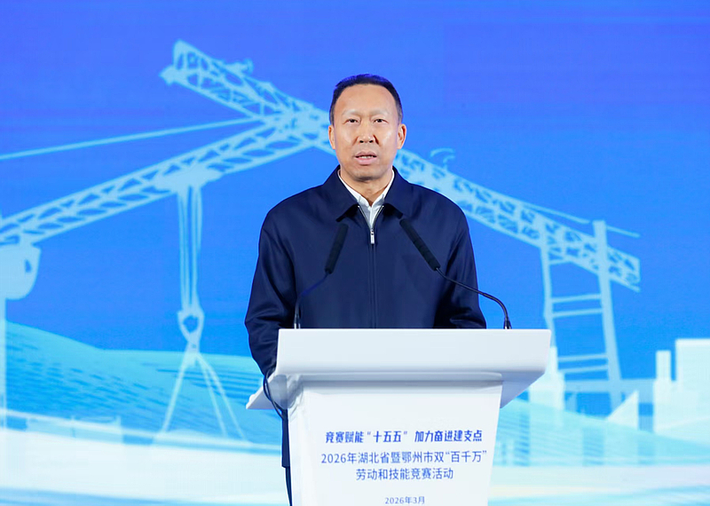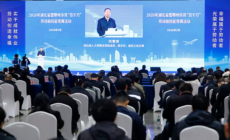 3月17日,2026年湖北省暨鄂州市双“百千万”劳动和技能竞赛在花湖国际机场启动。省人大常委会副主任、省总工会主席刘雪荣出席并讲话,鄂州市委书记孙兵致辞。