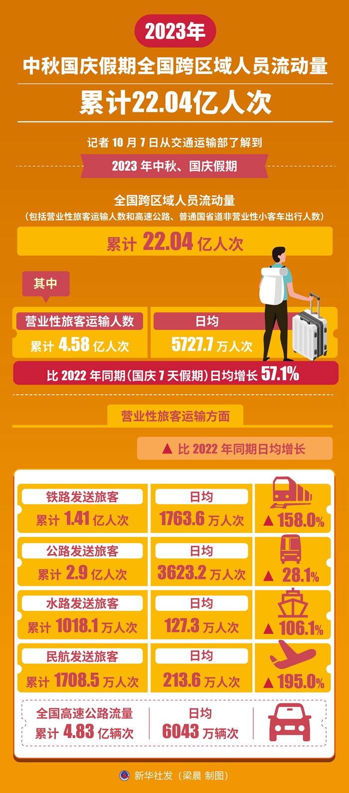 记者7日从交通运输部了解到,2023年中秋、国庆假期,全国跨区域人员流动量(包括营业性旅客运输人数和高速公路、普通国省道非营业性小客车出行人数)累计22.04亿人次。其中,营业性旅客运输人数累计4.58亿人次,日均5727.7万人次,比2022年同期(国庆7天假期)日均增长57.1%。
