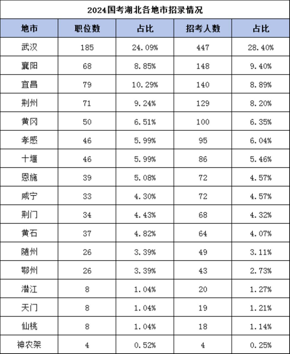 从各地市招录数据统计上可以看出,湖北招录人数较多的前三个地市分别是武汉、襄阳、宜昌。其中,武汉居第一位,共有185个职位,占湖北总职位的24.09%,共招447人,占湖北总招录人数的28.40%。