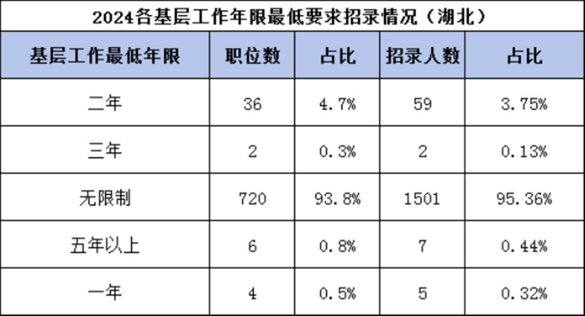 2024国考工作地点在湖北的职位有720个职位,不限制基层工作年限,占总招录职位的93.8%,这些职位共招1501人,占湖北总招录人数的95.36%,这对于大部分考生来说是利好消息。