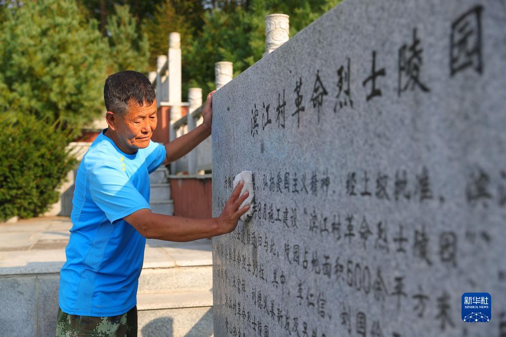 在辽宁省丹东市振兴区滨江村,村民擦拭滨江村革命烈士陵园石碑(2022年9月26日摄)。新华社记者 杨青 摄