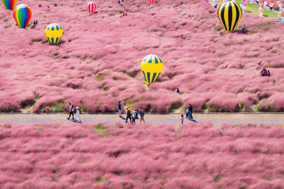 10月5日,在江苏省南京八卦洲陌上花渡,游人在粉黛乱子草丛中游玩(无人机照片)。新华社发(苏阳摄)