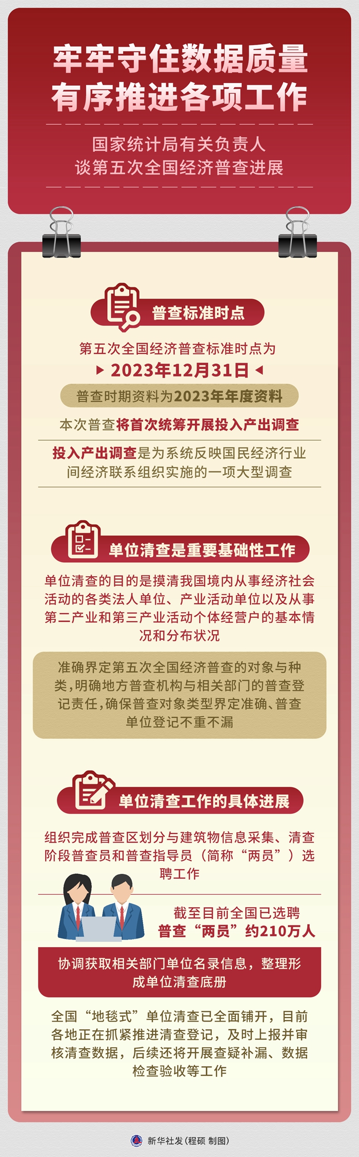国家统计局有关负责人表示,第五次全国经济普查将坚持数据质量第一原则,把“牢牢守住数据质量生命线”这一根本要求贯穿于普查工作各方面全过程。
