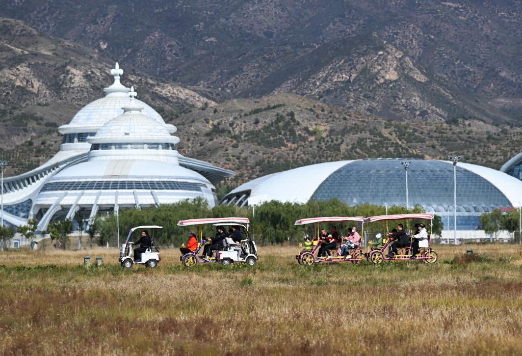 10月4日,游客在内蒙古呼和浩特市敕勒川草原游玩。新华社记者 刘磊 摄